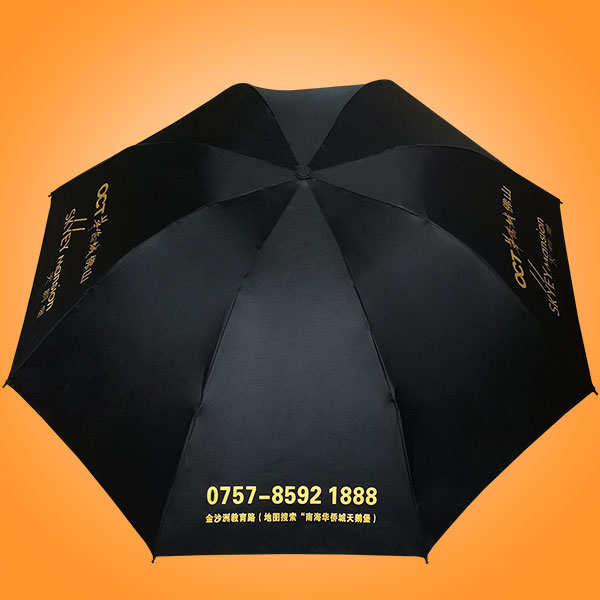 佛山制傘廠 三折廣告雨傘 佛山太陽傘廠、碰起布搭配電著鋼鐵傘架、傘面三個logo印刷金色、雨傘尺寸21寸,展開傘架直徑約100cm 經(jīng)濟、實用、霸氣!